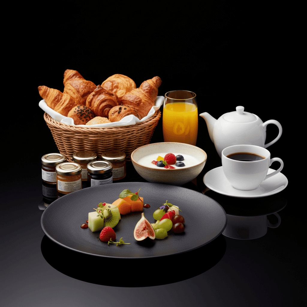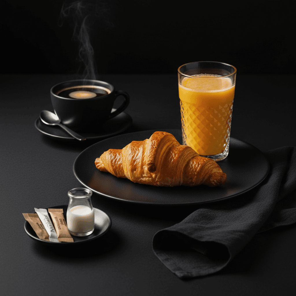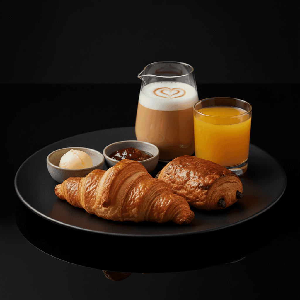 Croissant de mantequilla, zumo de naranja recién exprimido y café a tu gusto.