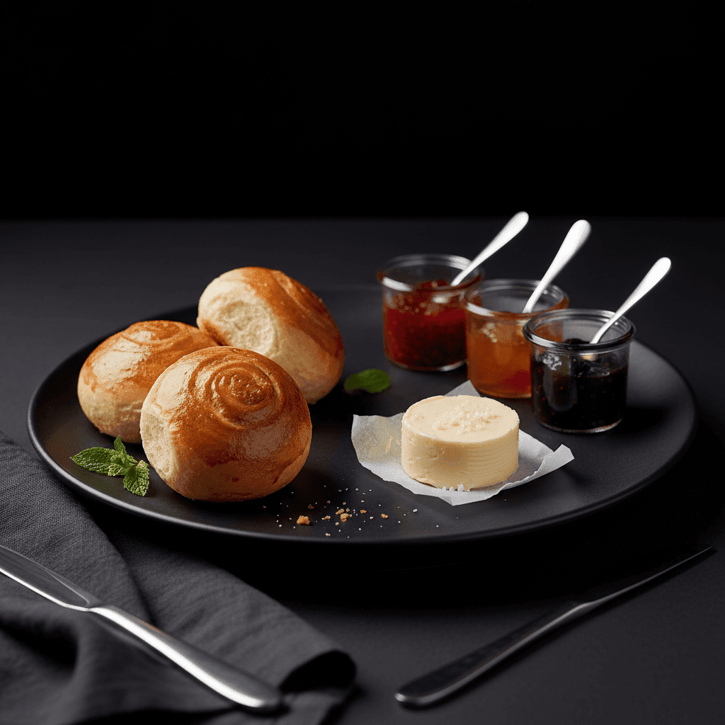 Panecillos dulces recién horneados con mantequilla y mermeladas variadas.