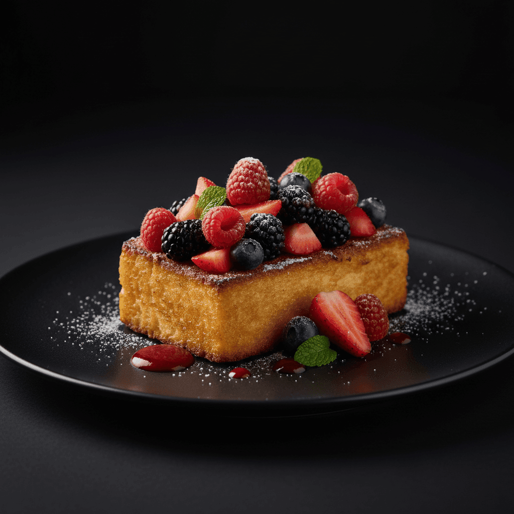 Brioche bañado en mezcla de huevo y leche, dorado a la plancha, con frutos rojos.